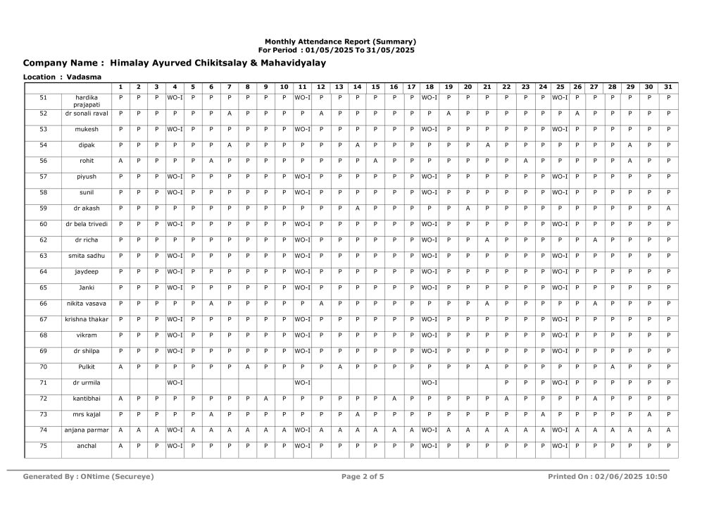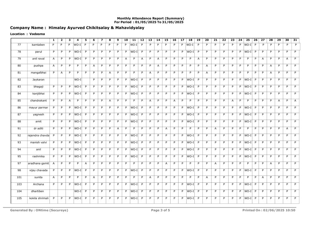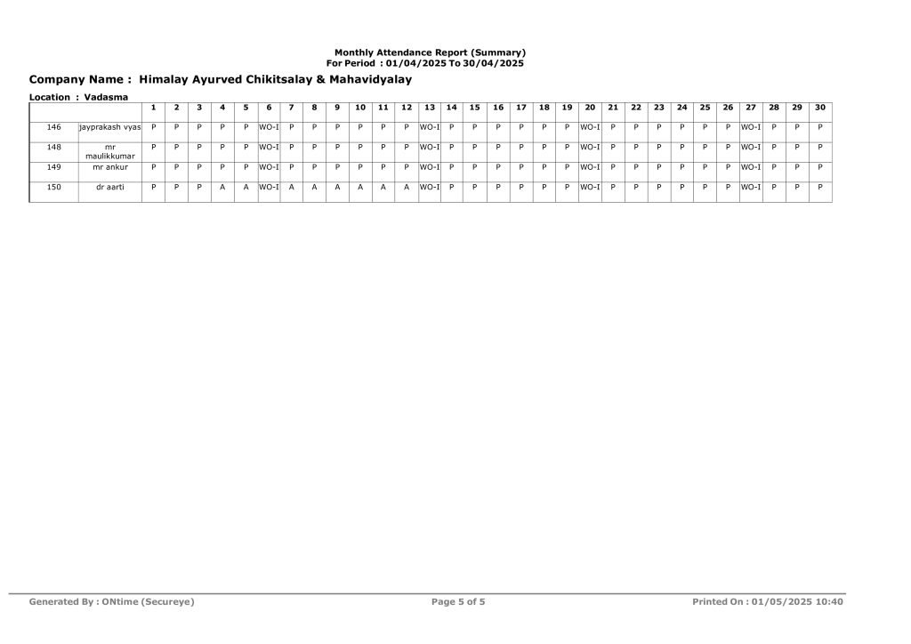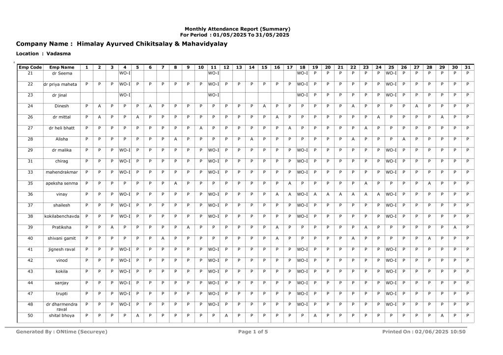 Monthly Attendance Report For Period (01/05/2025 To 31/05/2025)