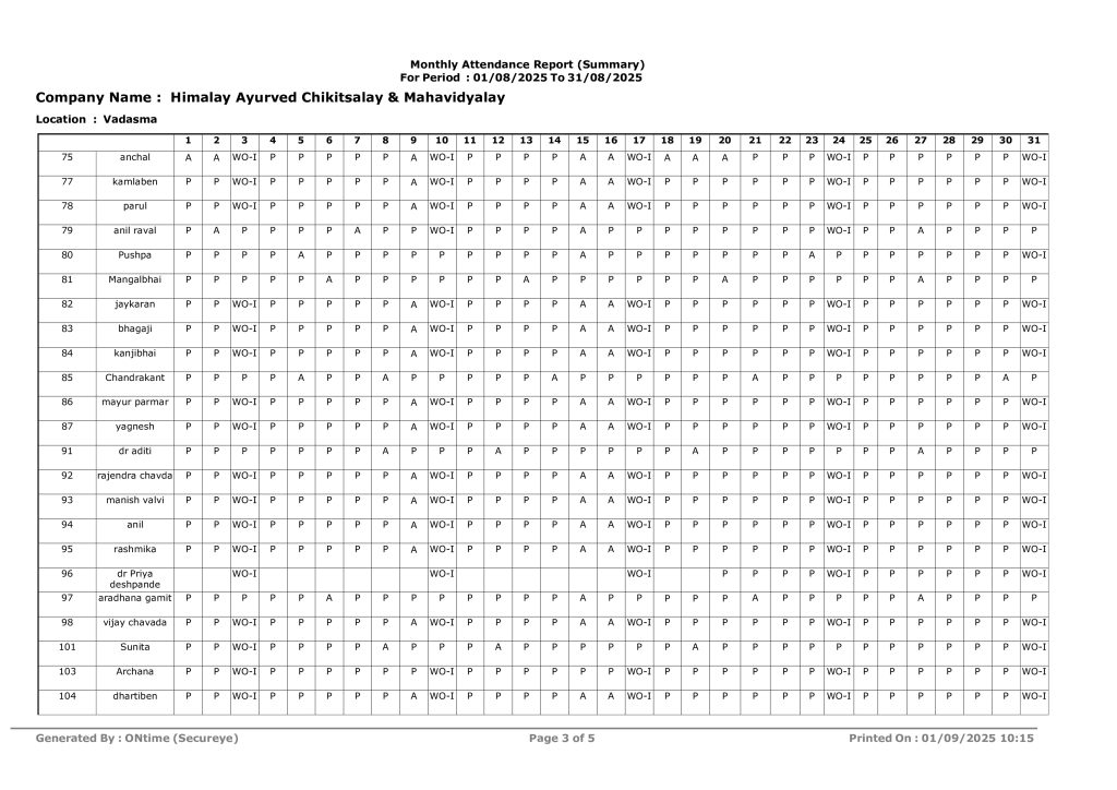 Monthly Attendance Report For Period (01/03/2025 To 31/03/2025)