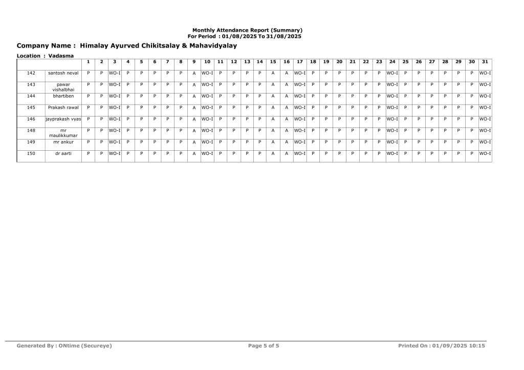 Monthly Attendance Report For Period (01/08/2025 To 31/08/2025)