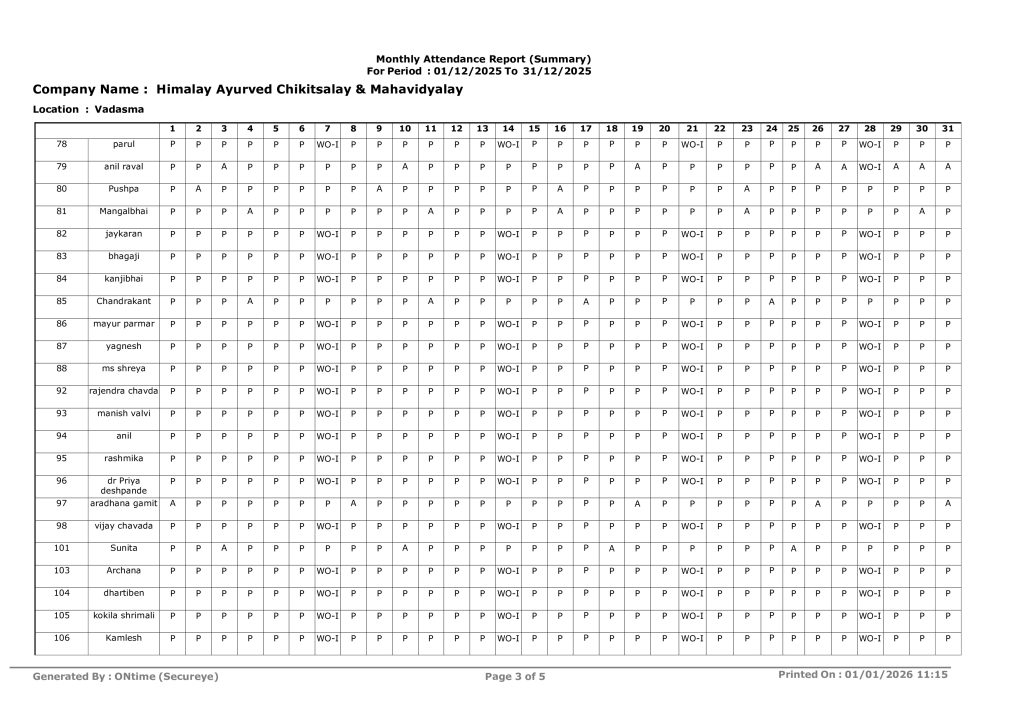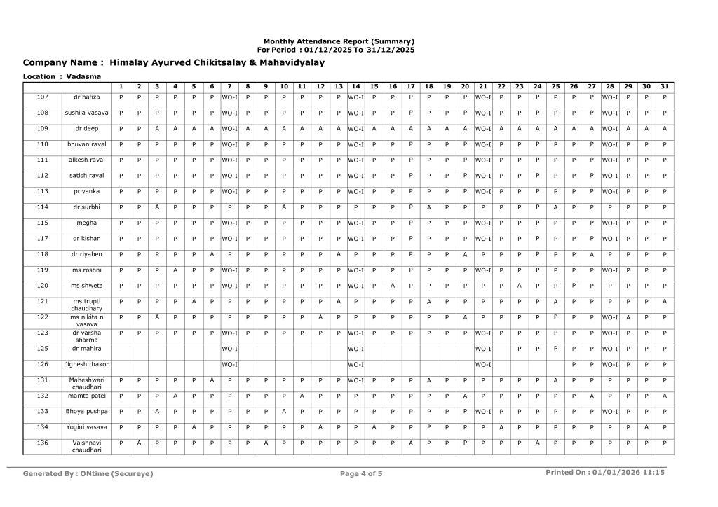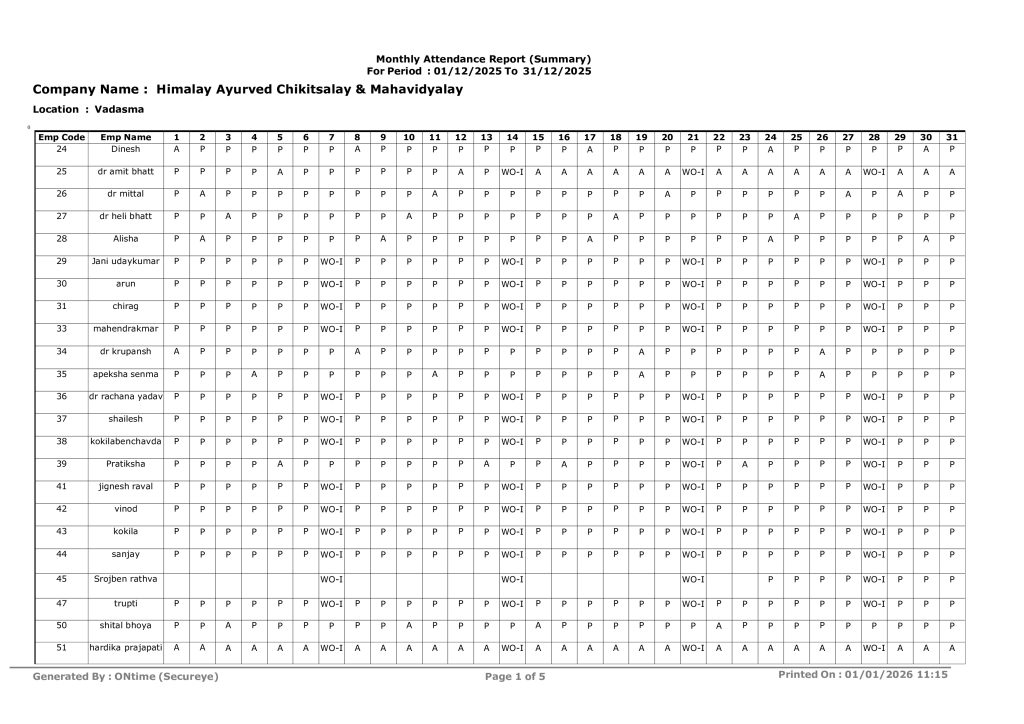 Monthly Attendance Report For Period (01/12/2025 To 31/12/2025)