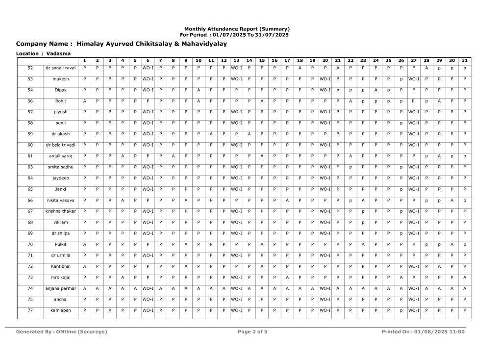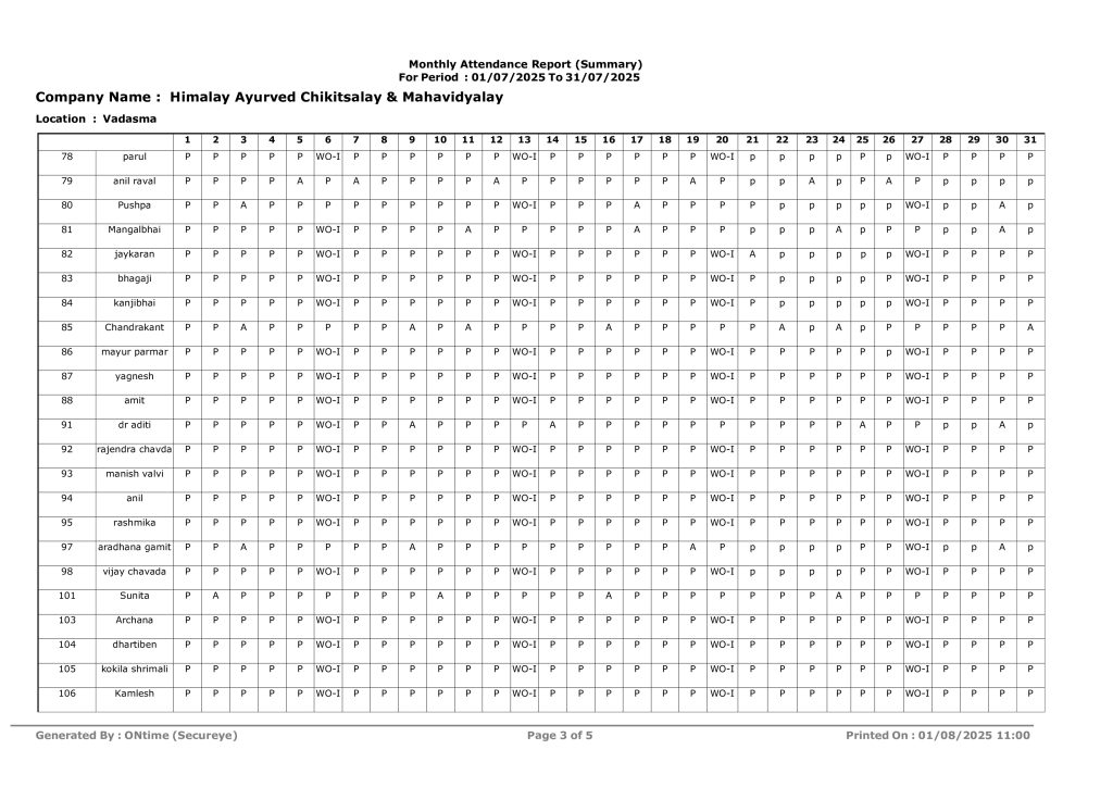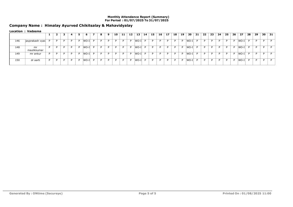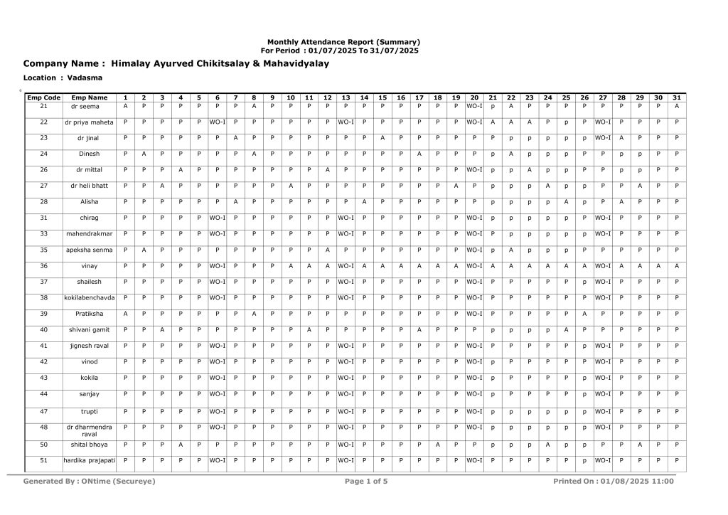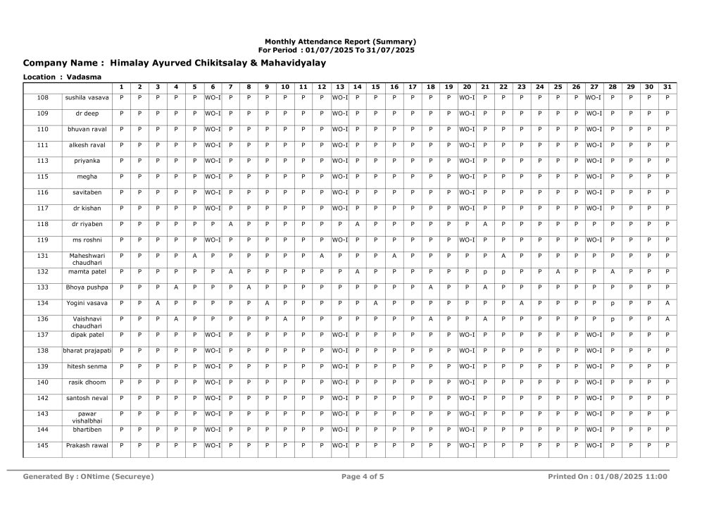 Monthly Attendance Report For Period (01/07/2025 To 31/07/2025)