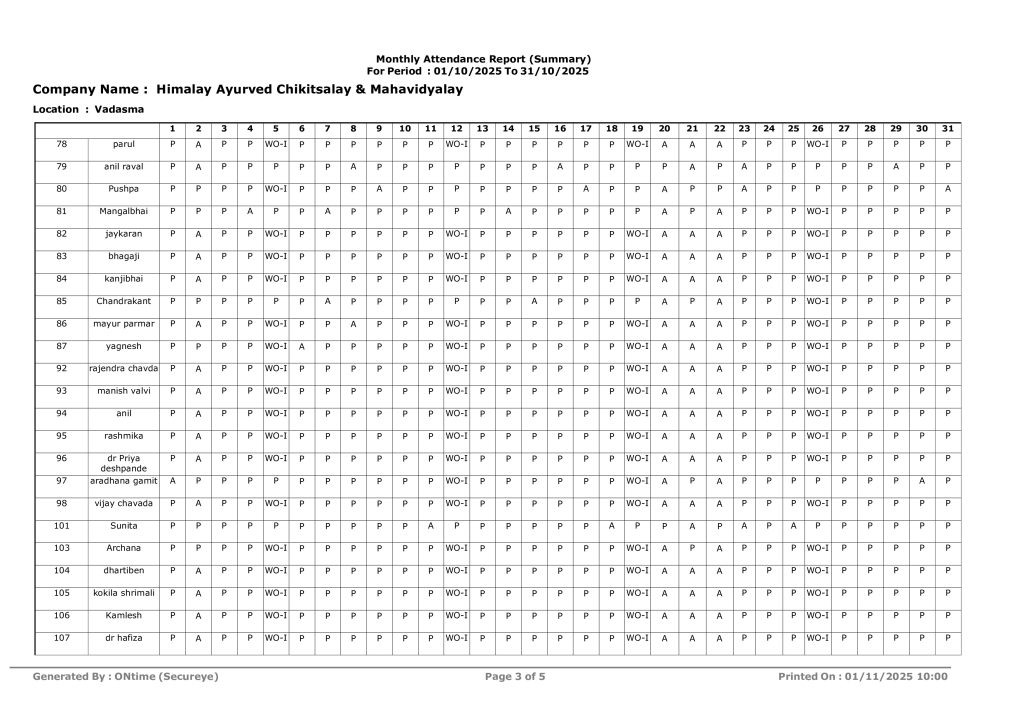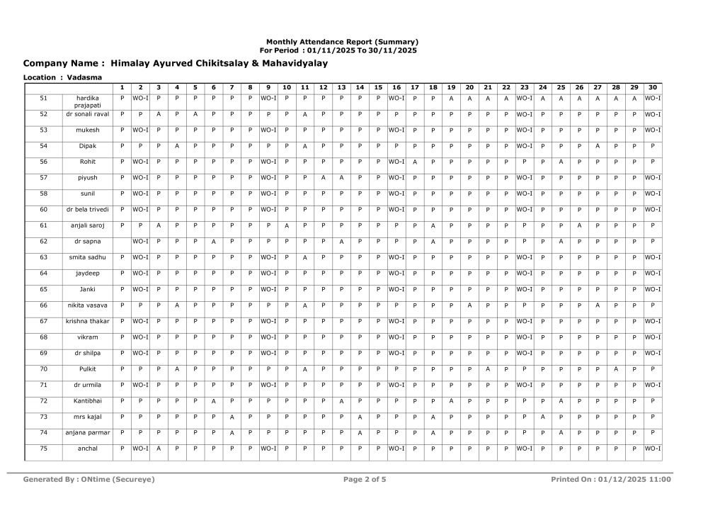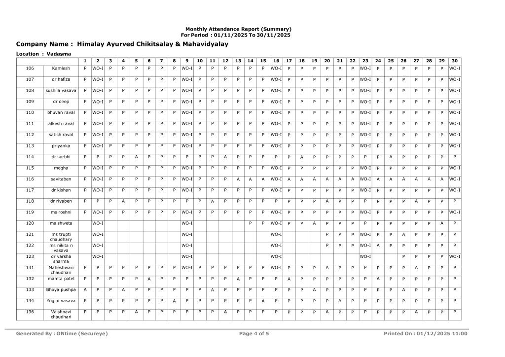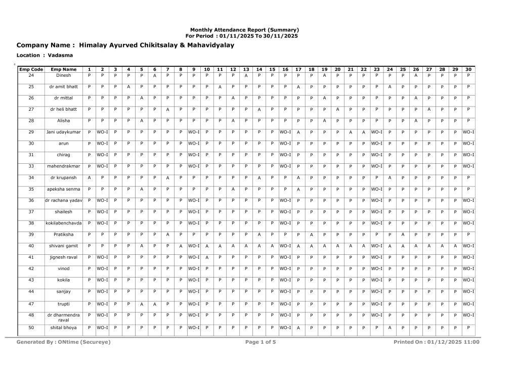 Monthly Attendance Report For Period (01/11/2025 To 30/11/2025)