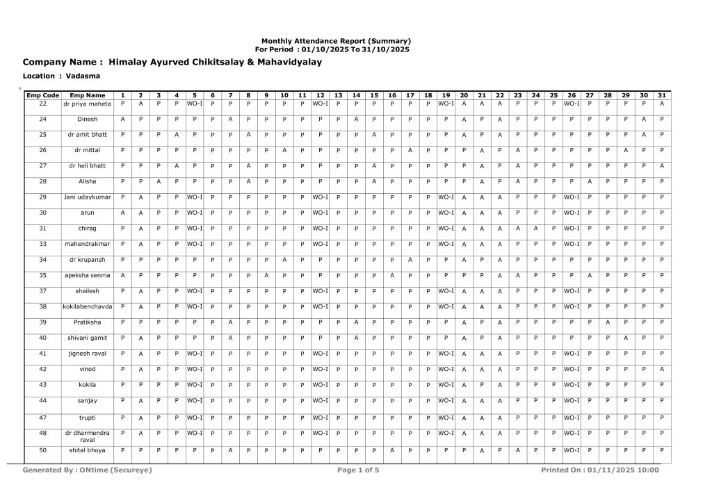Monthly Attendance Report For Period (01/10/2025 To 31/10/2025)
